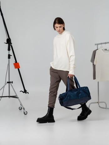 Цвет Outer Space лег в основу коллекции сумок Triangel, позволяя создать модное монохромное сочетание с изделиями Manevr темно-синего цвета. Изделия изготовлены из шелковистого полиэстера, в отделке использована лазерная перфорация паттерна.