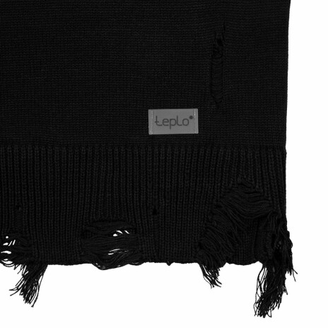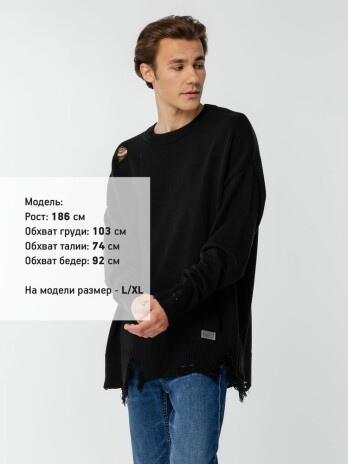 Оверсайз джемпер с круглым вырезом и рваными краями. Ворот, манжеты и низ изделия выполнены резинкой.