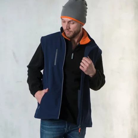 Основная ткань: цвет, близкий к Pantone 289 С, подкладка: цвет, близкий к Pantone 2965 C Двухслойная ткань softshell. Водонепроницаемый и дышащий мужской жилет. Небольшой воротник-стойка. Обратная контрастная пластиковая молния со съемным пуллером. Один нагрудный и два боковых кармана с обратной молнией. Утягивающий шнурок по низу жилета.