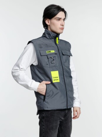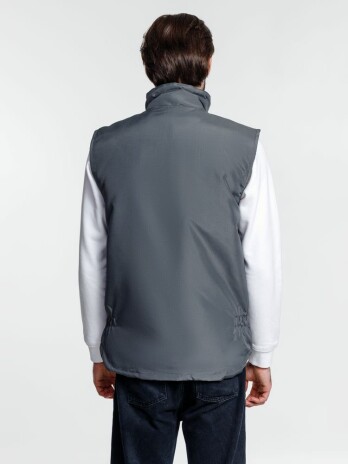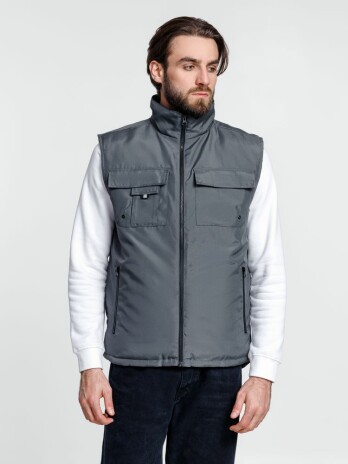 Мужской утепленный жилет с воротником-стойкой и удлиненной спинкой. Выполнен из ткани оксфорд с водоотталкивающим покрытием.