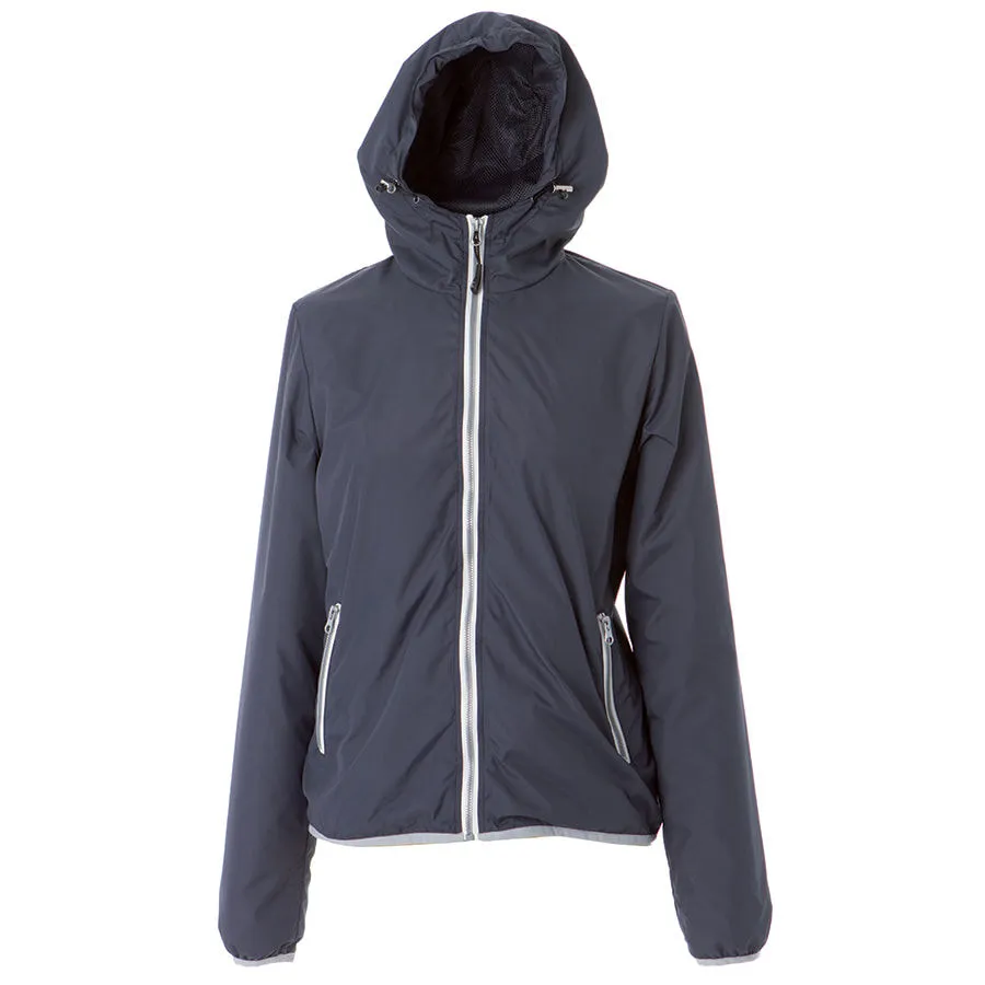 Ветровка водонепроницаемая из нейлона с «сеточкой». Два контрастных кармана на молнии и внутренний карман. Сетчатая подкладка с застежкой-молнией для легкой вышивки. Эластичная резинка по низу изделия и манжетах и регулируемые шнурки на капюшоне