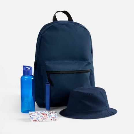 В нем есть все необходимое для комфортной летней прогулки: всегда актуальная в солнечный день панама, стиль которой можно менять буквально на ходу; бутылка для воды оптимального объема, а также сладкий снек для полезного и питательного перекуса. А захватить все с собой, конечно, будет удобно в лаконичном базовом городском рюкзаке, дополнительно оформленном ремувкой — стильным съемным текстильным брелком.