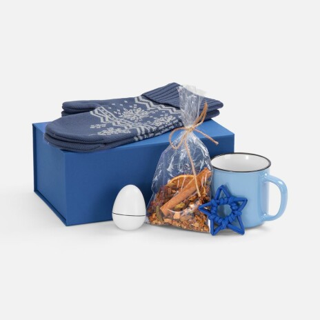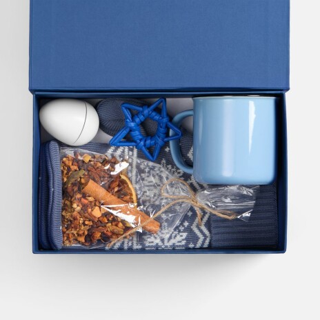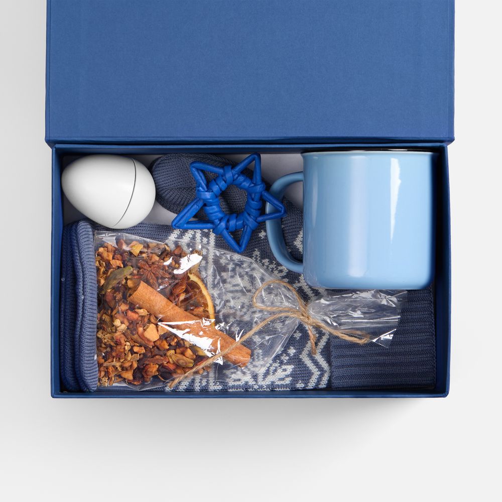 - Материал: варежки - акрил 100%; футляр для бальзама - пластик; кружка - фаянс; плетеная фигурка - бумага; коробка - переплетный картон, бумага Malmero «Скандинавский синий»