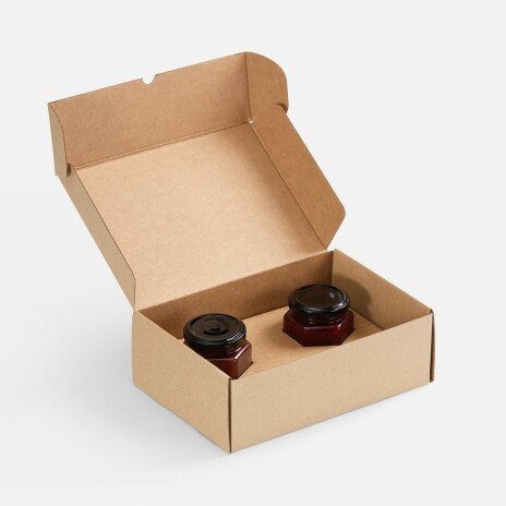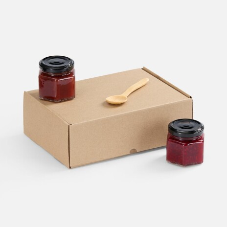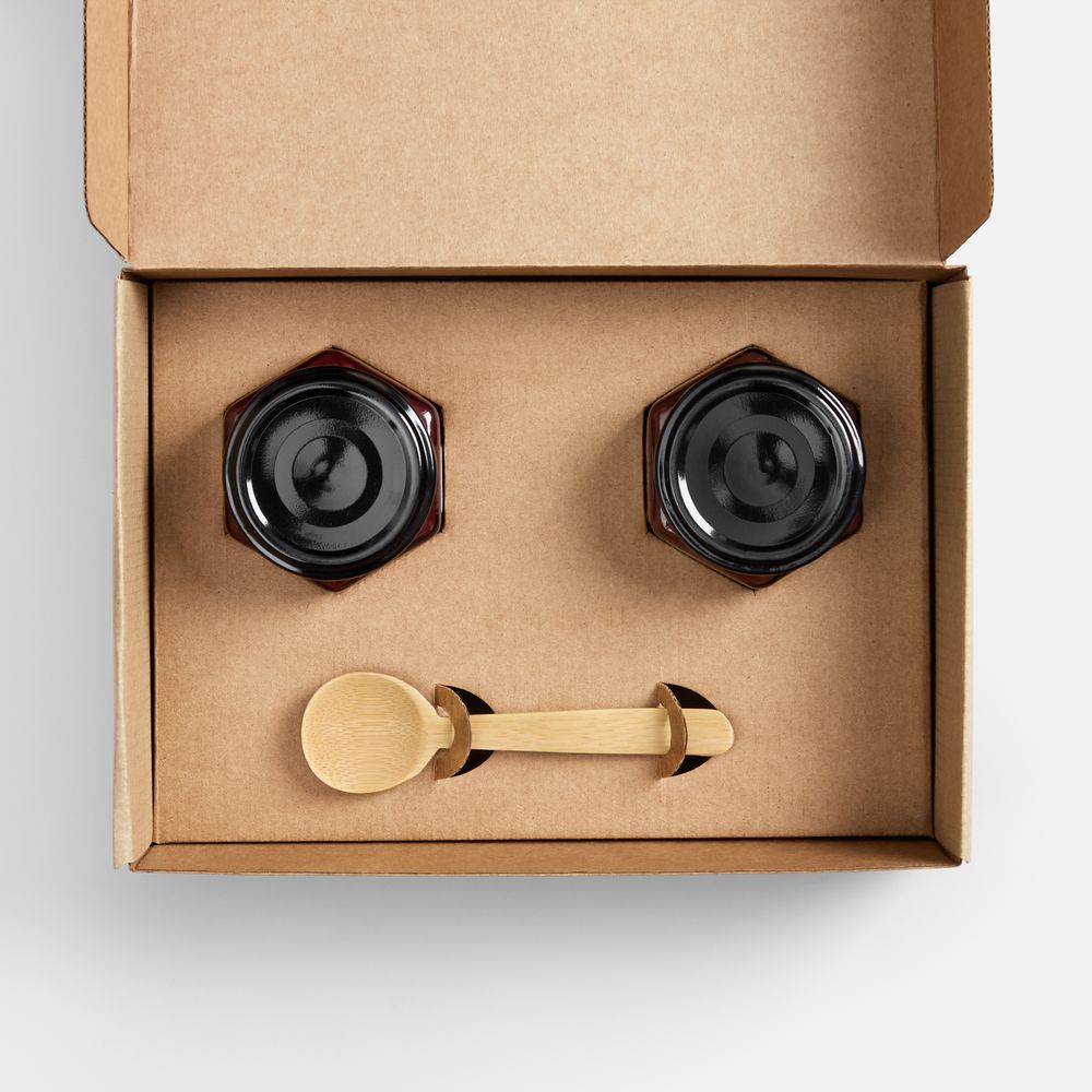 - Материал: коробка - микрогофрокартон; баночки - стекло, жесть; ложка - бамбук