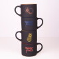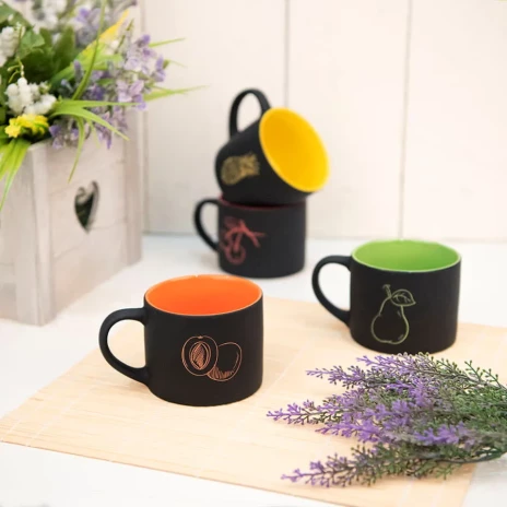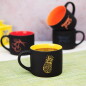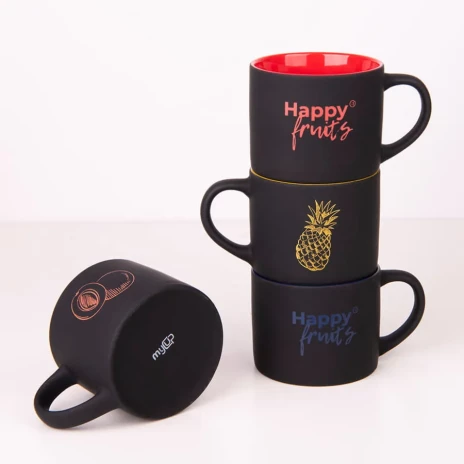 Кружка трендовой цилиндрической формы с черным прорезиненным покрытием.При гравировке подложка вскрывается в цвет внутренней части кружкиЦвет внутренней части близкий к Pantone 298C