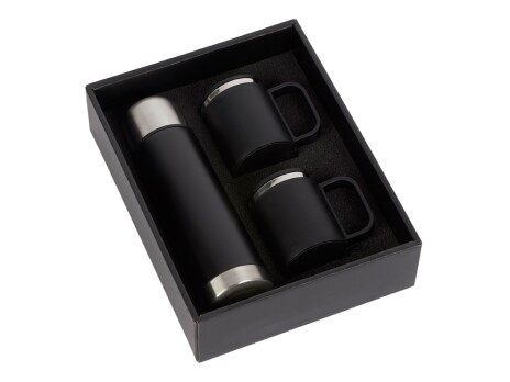 Термос на 500 мл и две термокружки на 200 мл из нержавеющей стали сверху декорированы пластиком, который не даст вашим рукам обжечься. Термос сохранит ваши напитки горячими более 6 часов. Термокружки держат тепло до 2 часов. На термос и кружки можно нанести логотип.
