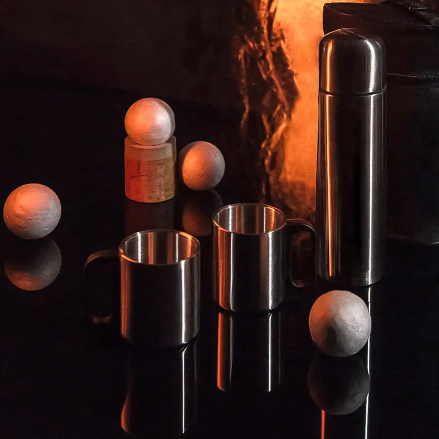 - Размеры: термос: D=6,7 см; H=24,5 см; 500 мл; кружки: D=6,7 см; Н=8 см; 220 мл