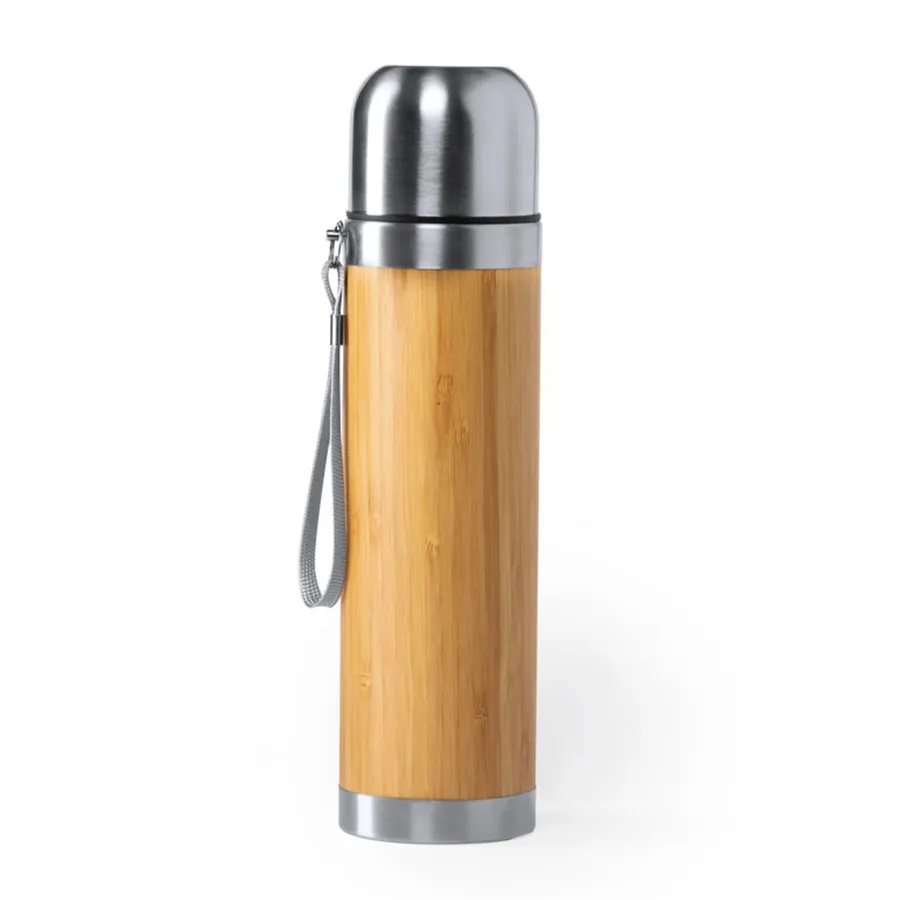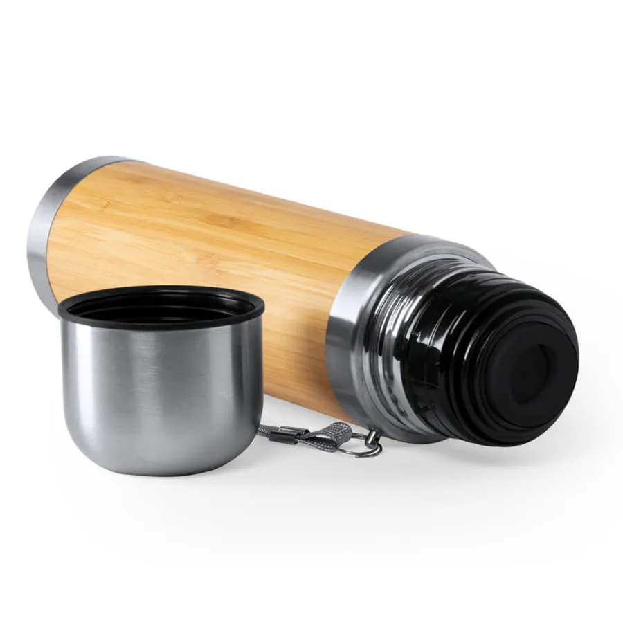 Термоc TIAKY объемом 420 мл в сочетании материалов из бамбука и нержавеющей стали. Не содержит бисфенола А, двойные стенки для лучшего и длительного сохранения температуры жидкости. Винтовой механизм закрытия, включая крышку стакан из нержавеющей стали. С ручкой для переноски. Упакован в индивидуальную коробку с эко-дизайном. Диаметр 6,5 см, вес 360 г.