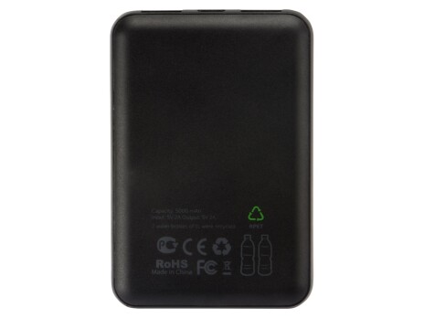 Компактный и стильный повербанк. Корпус, включая поверхность с отделкой "под ткань", на 100% состоит из переработанного ПЭТ-пластика. Для его изготовления было использовано две литровых одноразовых пластиковых бутылки. Универсальный внешний аккумулятор поставляется в крафтовой упаковке с использованием растительных чернил на основе сои. Повербанк имеет 2 выходных USB разъема, входные разъемы USB-C и micro USB, а также кабель 3-в-1. - Универсальный компактный повербанк на 5000 мАч - Корпус на 100% состоит из переработанного ПЭТ (rPET) - Упаковка из переработанной бумаги и соевых чернил - Кабель 3-в-1 в комплекте