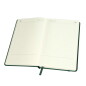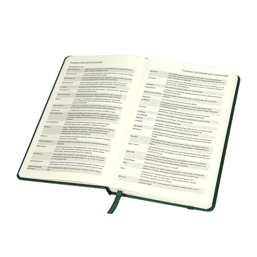 Цвет обложки, близкий к пантону 3435С Размер 130*210 мм, переплет твердый Обложка PVC Блок недатированный, в линейку Скругленные углы Бумага кремовая, плотность 70г м2 Форзац нахзац кремовые 272 страницы 8 инфостраниц для путешествий Классическая резинка, 7мм Ляссе в цвет обложки Упаковка прозрачный полибэг