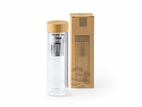 Бутылка из боросиликатного стекла с двойными стенками и бамбуковой крышкой. Включает ситечко для заваривания чая, так что вы можете взять его с собой куда угодно. Объем 420 мл.