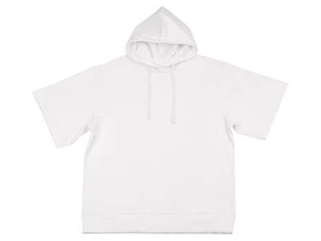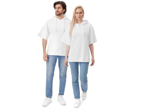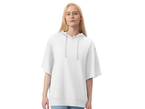 Худи с коротким рукавом выполнено из хлопкового френч терри с петельками на изнаночной стороне. Подкладка капюшона выполнена из основного полотна для объемной посадки. Модель комфортной и актуальной посадки оверсайз отлично подходит для обычной жизни и в качестве промо мерча. - оверсайз посадка - низ обработан рибом 2х2 и дополнительно отстрочен для укрепления - мягкое и качественное полотно френч терри - увеличенная зона для нанесения из-за отсутствия кармана