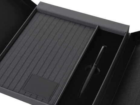 "Bradbury & Co" - это элегантный подарочный набор, упакованный в красивую коробку на магните. Внутри — блокнот в обложке из рифленой экокожи и металлическая шариковая ручка. Ручка гармонирует с блокнотом за счет рифленой нижней части, а блокнот имеет специальный патч для нанесения логотипа (который можно также нанести на более ровную поверхность на обороте блокнота) и ляссе-закладку для удобства. При гравировке на ручке вскрывается эффектный серебристый цвет. Внутри блокнота - 80 листов кремовой бумаги 80 г/м2 с FSC-сертификатом ответственного лесопользования. Стержень ручки заправлен синими немецкими чернилами Dokumental и швейцарским пишущим узлом Premec, что обеспечивает мягкость и плавность письма.
