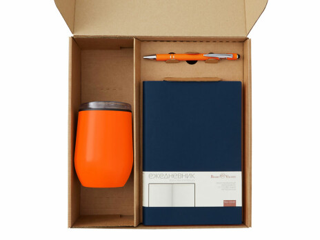 - Материал товара - ежедневник - искусственная кожа, термокружка - нержавеющая сталь снаружи, полипропилен внутри, ручка - металл c покрытием soft-touch, ситечко - нержавеющая cталь