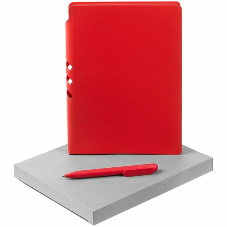 Удобный ежедневник с гибкой обложкой и местом под ручку в корешке, миниатюрная ручка из переработанного пластика и компактная самосборная коробка — простые составляющие полезного делового набора.