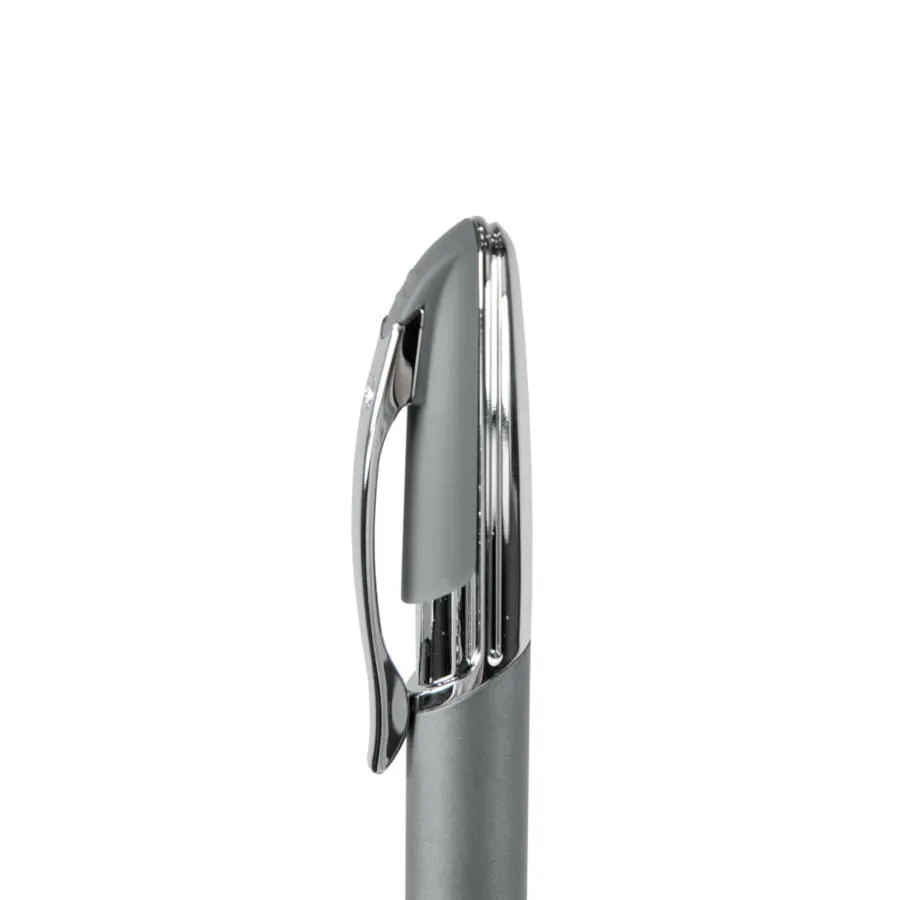 • Pantone, близкий к 422C.• Металлический корпус и клип. • Нажимной механизм подачи стержня.• Пулевидный пишущий узел 1.0 мм.• Шарик из карбида вольфрама.• Длина линии письма 1000 м.• Цвет чернил синий.• Сменный стержень Parker Type.• Виды нанесения: лазерная гравировка, тампопечать.