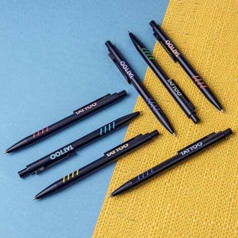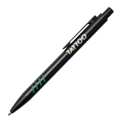 Цветные грип-вставки, контрастирующие с полностью черным корпусом - не единственная особенность TATTOO. На этой ручке возможна двухцветная 3D-гравировка. Зеркальная подложка в цвет прорезиненных вставок в сочетании с белым матовым покрытием позволяют получить эффект объема при нанесении логотипа или рекламного сообщения. Pantone, близкий к 348С.