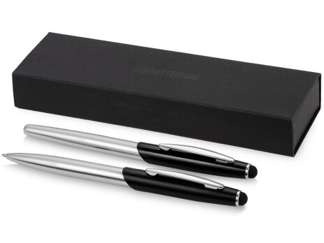 Набор состоит из 2-х ручек со стилусами: шариковой и роллера. Изящная шариковая ручка-стилус и ручка-роллер с матовой верхней частью и блестящей хромированной нижней частью и соответствующими хромированными вставками. Набор ручек Roma будет отличным деловым подарком к любому празднику.