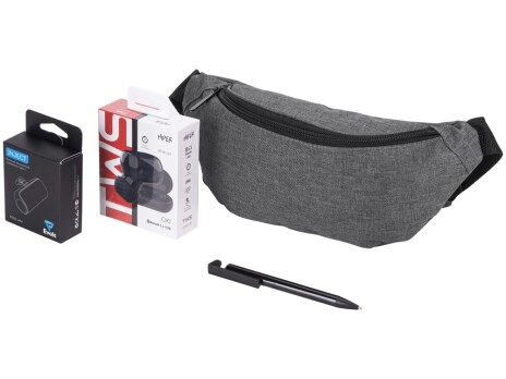 - Комплектность - сумка на пояс, ручка шариковая, беспроводные наушники, повербанк