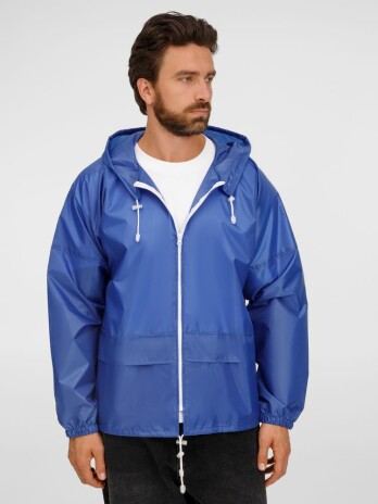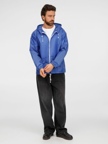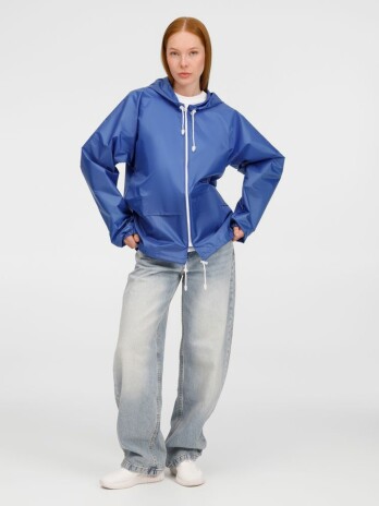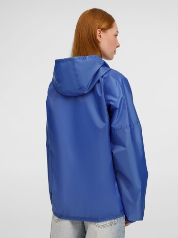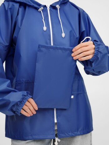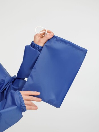 Укороченный дождевик свободного кроя из ткани таффета с влагозащитным покрытием. Складывается в мешочек — удобно брать с собой.
