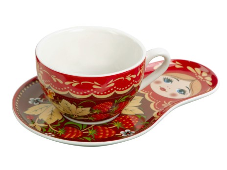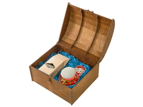 В наборе вы найдете необычную чайно-кофейную пару с подставкой в виде русской «Матрешки», которая является одним из главных символов России и чай "Малина с мятой" травяной, 70 г. Набор поставляется в большой деревянной коробке в виде сундука с замочком.