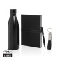Этот элегантный подарочный набор включает всё необходимое, чтобы рабочий день проходил стильно и комфортно. Термобутылка объёмом 480 мл с двойными стенками изготовлена из переработанной нержавеющей стали. Вакуумная изоляция сохранит ваши напитки горячими или холодными в течение нескольких часов. Благодаря герметичной крышке можно носить бутылку в сумке или рюкзаке без риска протекания. Премиальный брелок Swiss Peak с глянцевым металлическим покрытием и элегантным ремешком из качественной искусственной кожи — стильный аксессуар, который всегда держит самые важные ключи под рукой. Для заметок и идей в наборе предусмотрены: • Шариковая ручка в деловом стиле с запасом синих чернил, позволяющих провести линию длиной до 1000 метров • Блокнот формата А5 с мягкой обложкой из переработанного полиэстера и 160 страницами кремового цвета из переработанной бумаги. Все предметы в наборе сертифицированы по стандарту RCS (Recycled Claim Standard). Это гарантирует полностью отслеживаемую цепочку поставок переработанных материалов.