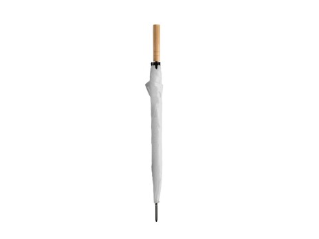 Зонт с деревянной ручкой и автоматическим открытием. Спицы и отделка черного цвета. Застежка на липучке.