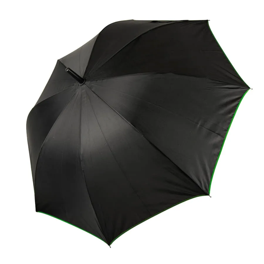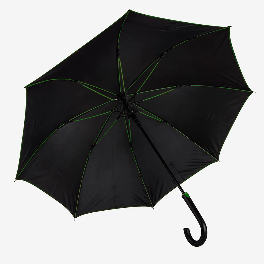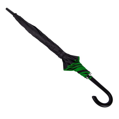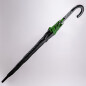 Зонт-трость с пластиковой ручкой, полуавтомат.Диаметр купола: 103 см, длина стержня 85 см.Состав купола: 100% полиэстер 190TСостав стержня: металл.Состав спиц: стекловолокно.Ручка пластик. Цвет купола: чёрный + кант зелёного цвета.
